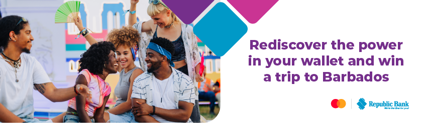 During the period August 25 – October 17, 2025, every purchase* of NAF45 or more with your Republic Bank Mastercard will earn you a chance to win the Grand Prize of a VIP trip for 2 persons to Barbados for The Food and Rum Festival in November!